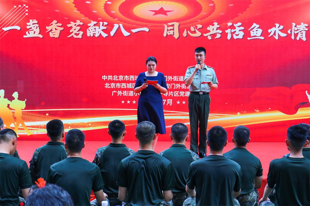 八一建軍節(jié)前夕,武警北京總隊(duì)執(zhí)勤第六支隊(duì)與北京市廣安門外街道聯(lián)合舉辦“一盞香茗獻(xiàn)八一 同心共話魚水情”軍民雙擁共建文藝聯(lián)歡會(huì),為基層官兵送上一臺(tái)精彩紛呈的文化盛宴。