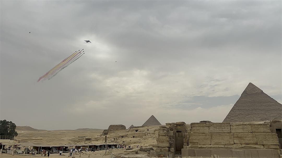 開羅當(dāng)?shù)貢r(shí)間8月28日中午時(shí)分,受邀參加首屆埃及航展的中國空軍1架運(yùn)-20與八一飛行表演隊(duì)6架殲-10表演機(jī)編隊(duì)飛越金字塔,在空中拉出象征中埃兩國國旗顏色的六道彩煙。