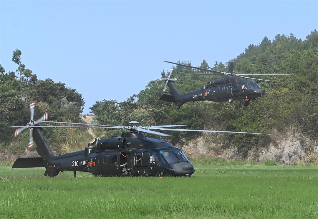 圖為直升機搭載作戰(zhàn)隊員飛赴機降地域。
