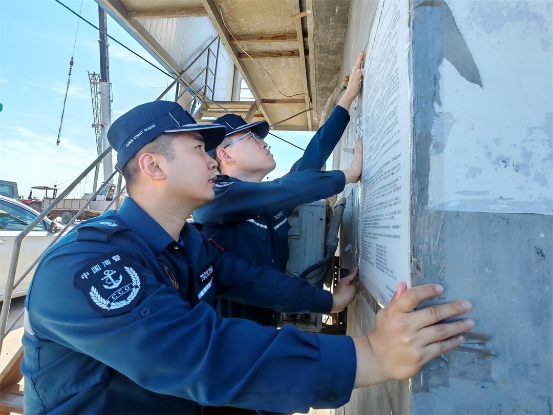 圖為6月27日,山東煙臺(tái)海警局長(zhǎng)島工作站執(zhí)法員在轄區(qū)北長(zhǎng)山島北城碼頭張貼執(zhí)法公告。盧煜萱 攝