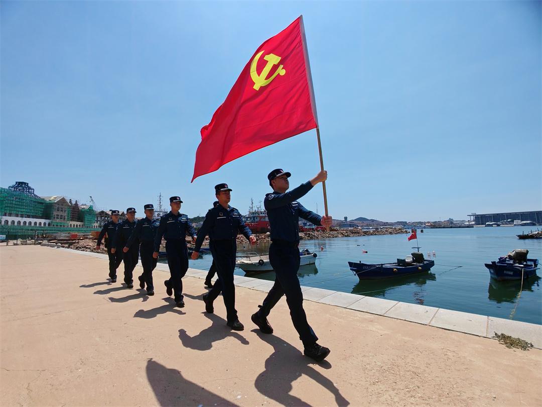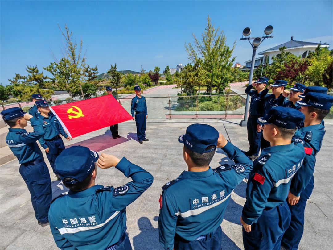 圖為7月1日,山東煙臺(tái)海警局長(zhǎng)島工作站組織執(zhí)法員重溫入黨誓詞。盧煜萱 攝