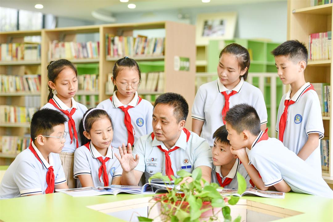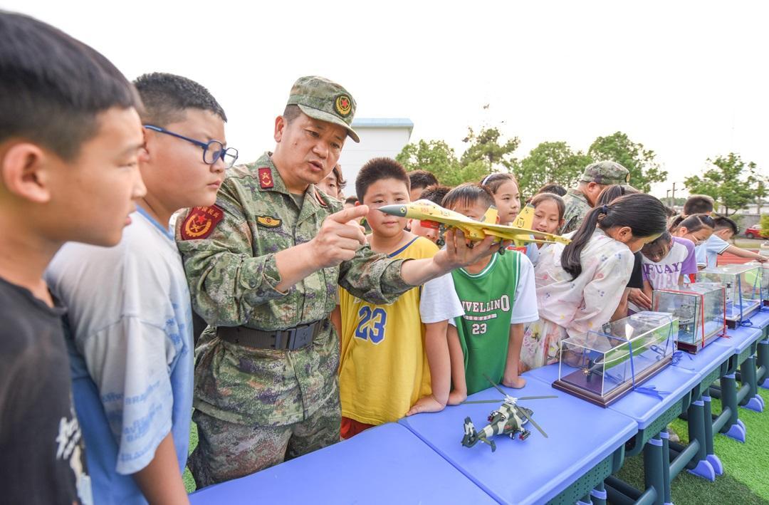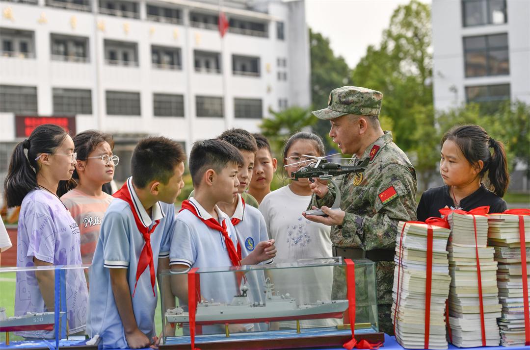圖為合肥市廬陽區(qū)人武部文職人員孫勁在向?qū)W生普及國(guó)防知識(shí)。