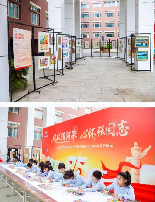 戶外展區(qū),“童心繪盛世,丹青耀中華”書畫作品展率先引爆全場。國畫、油畫、素描、彩鉛、漫畫……一幅幅由學(xué)生精心創(chuàng)作的作品琳瑯滿目,色彩斑斕,每一筆都透露出孩子們對(duì)祖國的深情厚意和對(duì)美好生活的無限憧憬。特別是那幅由16位學(xué)生共同手繪的7.5米長的巨型畫卷,如同絢麗的彩虹,將孩子們的夢(mèng)想與祖國的未來緊緊相連。