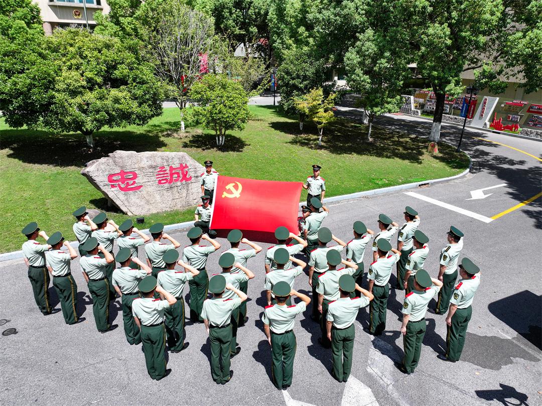 圖為中隊預備黨員面對黨旗莊嚴宣誓。