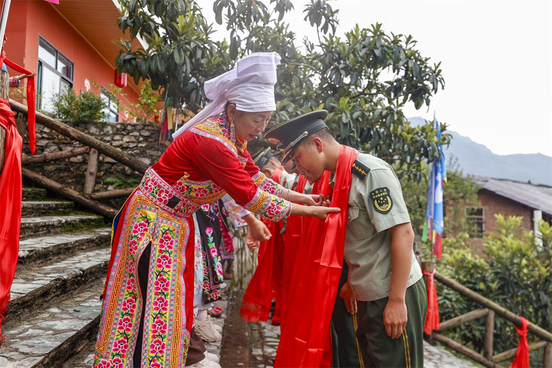 圖為北川羌族人民為武警官兵獻(xiàn)上羌紅。