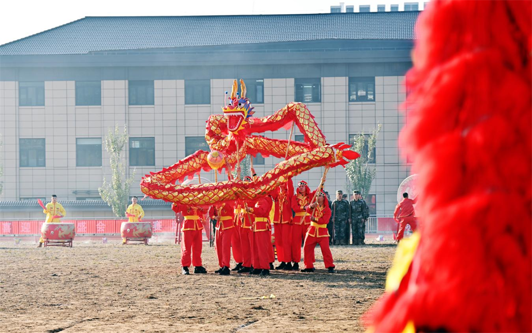 開(kāi)幕式現(xiàn)場(chǎng),由官兵演繹的節(jié)目“鑼鼓震天、龍騰獅舞”將氣氛推向高潮。具有濃厚“兵味”“戰(zhàn)味”的刺殺表演,彰顯了官兵能戰(zhàn)、善戰(zhàn)、勝戰(zhàn)的決心和意志。