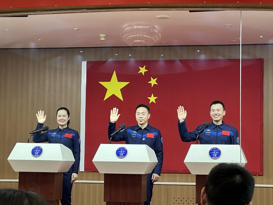 10時(shí),蔡旭哲、宋令東、王浩澤3名乘組航天員在酒泉衛(wèi)星發(fā)射中心問(wèn)天閣與中外媒體記者集體見(jiàn)面。