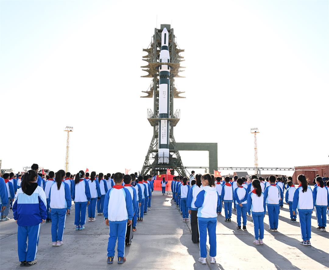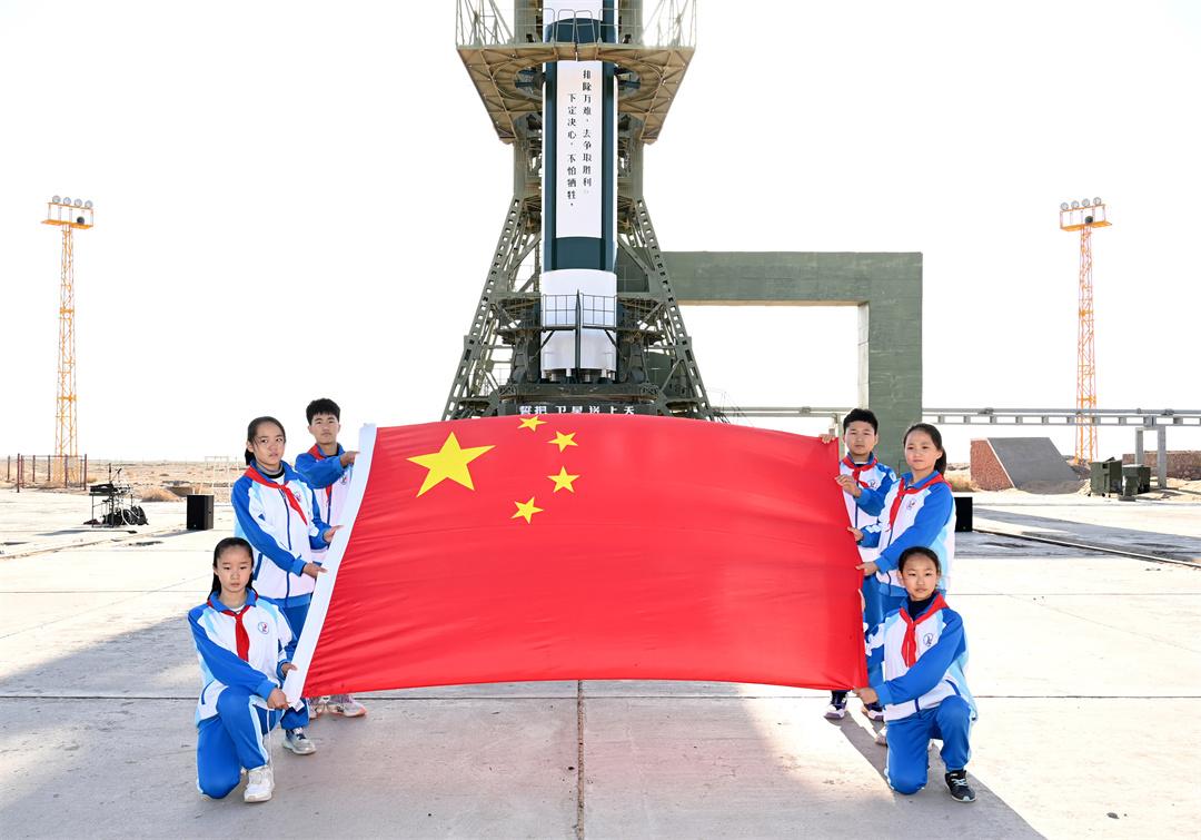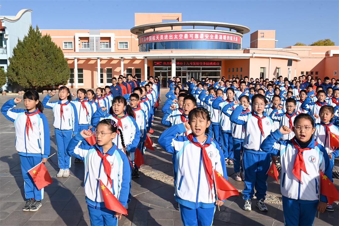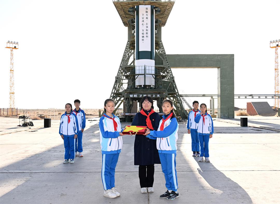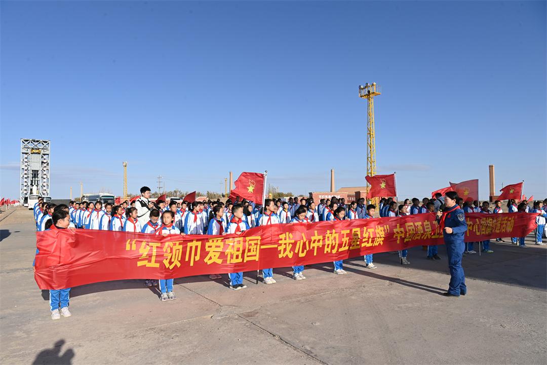 隨后,少先隊員們帶著國旗前往載人航天發(fā)射場。神舟十九號載人飛船發(fā)射任務0號指揮員趙磊為少先隊員們介紹了這座我國目前唯一的載人航天發(fā)射塔架。就在前幾天,神舟十九號航天員乘組從這里飛向中國空間站。截至目前,這里發(fā)射了19艘神舟飛船,將24名38人次航天員送入太空。這面滿載榮譽的國旗正是從這個塔架上隨航天員一同進入中國空間站。