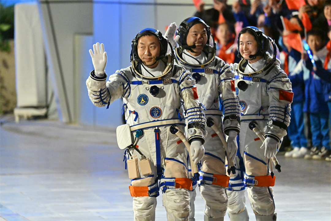 圖為10月30日,神舟十九號航天員蔡旭哲、宋令東、王浩澤(從左至右)在出征儀式上。李鑫 攝