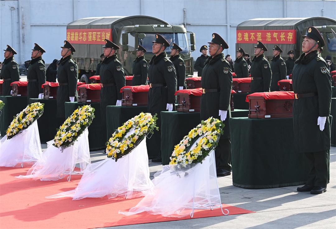 11月28日,第十一批在韓中國(guó)人民志愿軍烈士遺骸回到祖國(guó)母親懷抱。43位志愿軍烈士英靈及495件遺物由我空軍專機(jī)從韓國(guó)接回并護(hù)送至遼寧沈陽(yáng)。