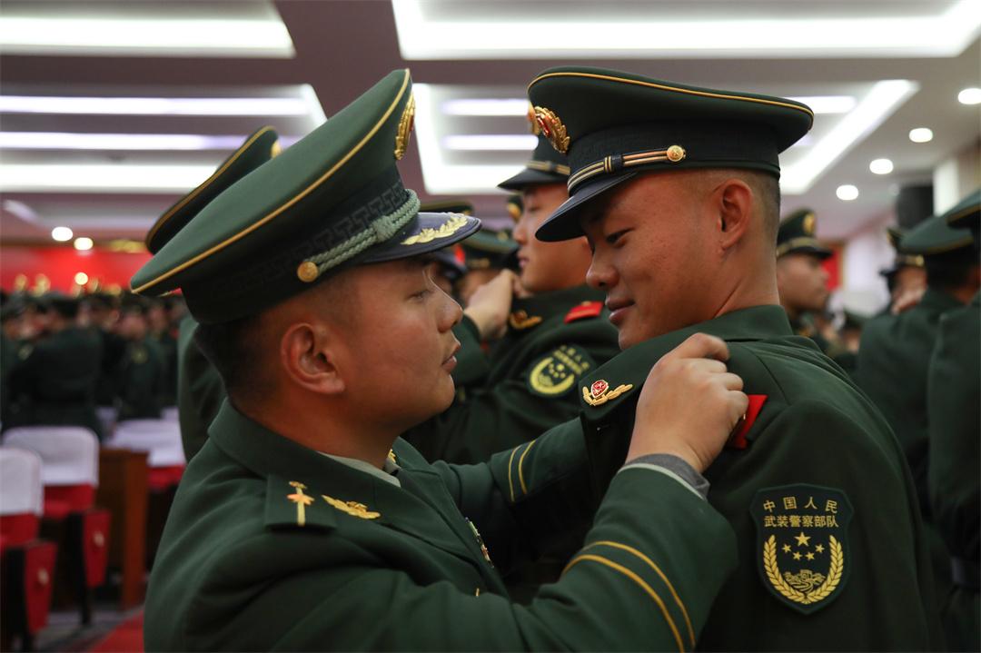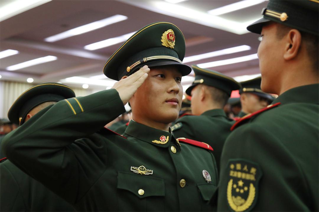 授銜儀式上,全體新戰(zhàn)友相互佩戴嶄新的紅肩章和閃耀的警徽,互敬軍禮,眼神中閃爍著驕傲與自豪的光芒。從這一刻起,他們正式成為武警部隊(duì)的一員,肩負(fù)起保家衛(wèi)國(guó)神圣使命?!翱嗑殮潮绢I(lǐng),時(shí)刻準(zhǔn)備戰(zhàn)斗,決不叛離軍隊(duì),誓死保衛(wèi)祖國(guó)?!比w新兵高舉右拳莊嚴(yán)宣誓,誓詞鏗鏘,字字千鈞,詮釋著軍人的使命和擔(dān)當(dāng)。