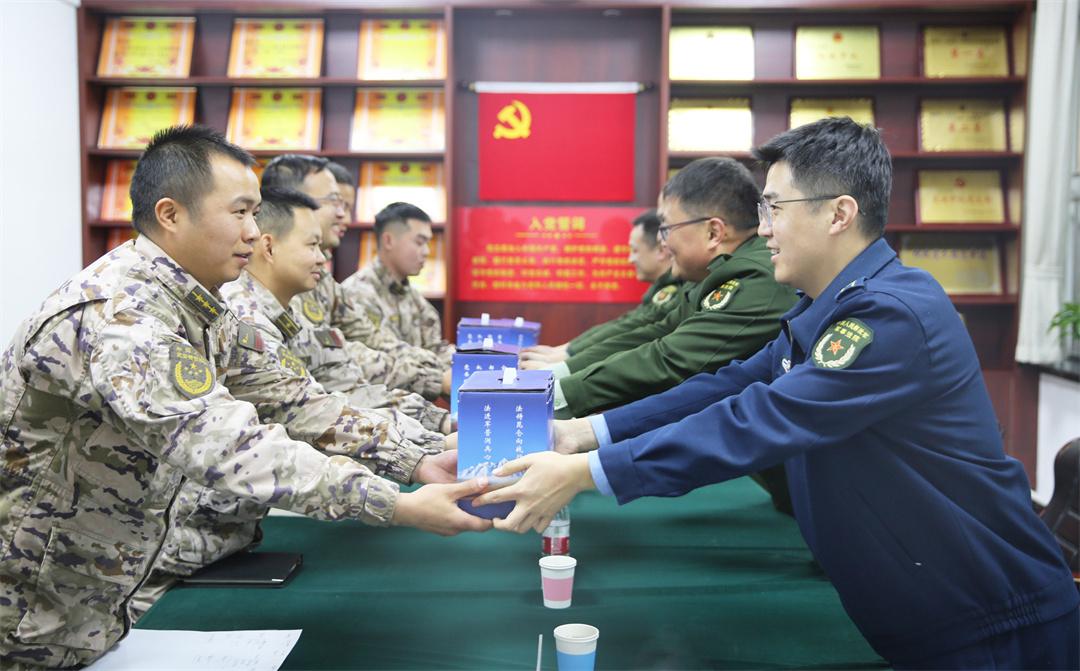 圖為向官兵贈(zèng)送普法產(chǎn)品。