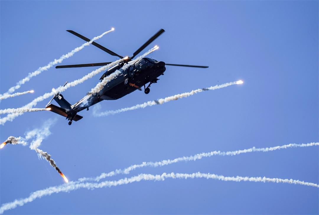 圖為直-20戰(zhàn)機發(fā)射干擾彈。陳凱 攝