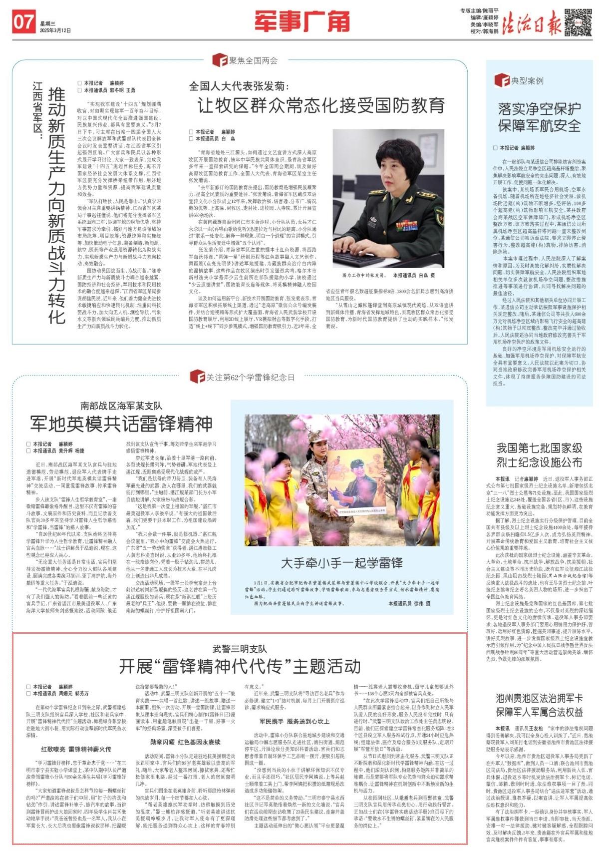在第62個(gè)學(xué)雷鋒紀(jì)念日到來(lái)之際,武警福建總隊(duì)三明支隊(duì)組織官兵深入學(xué)校、社區(qū)和老兵家中,開展“雷鋒精神代代傳”主題活動(dòng)。橄欖綠身影穿梭在駐地大街小巷,用實(shí)際行動(dòng)詮釋新時(shí)代軍民魚水深情。