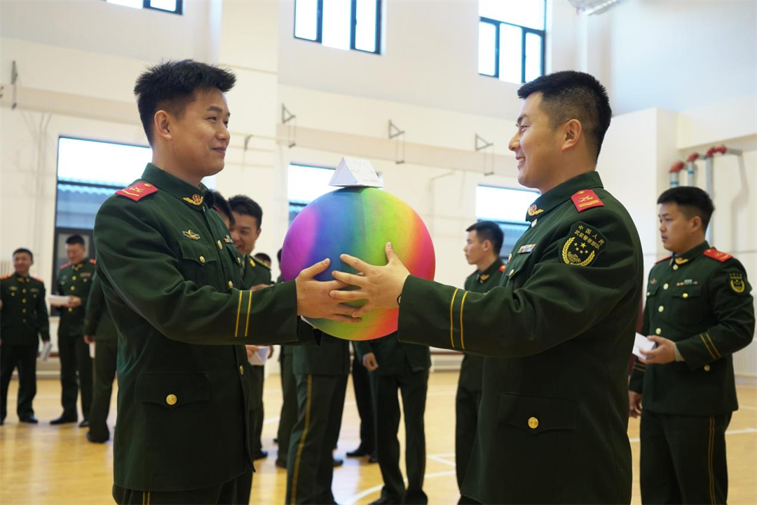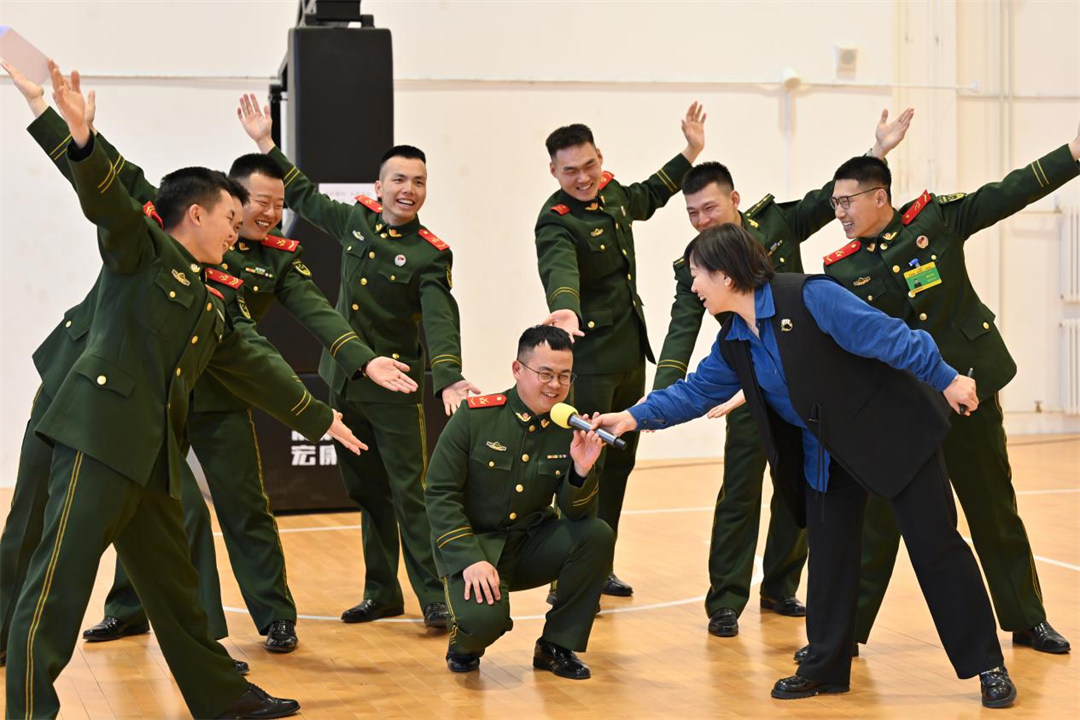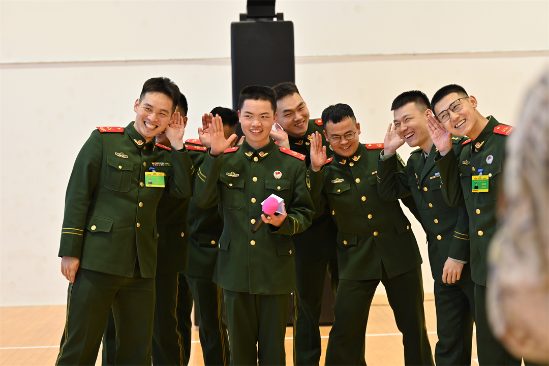 “快快快,到你了。”互動(dòng)現(xiàn)場(chǎng)到處洋溢著歡聲笑語(yǔ),“找相似”“桃花朵朵開”等互動(dòng)游戲正在火熱進(jìn)行,官兵們?cè)谛睦砝蠋煄ьI(lǐng)下用趣味游戲盡情釋放壓力。