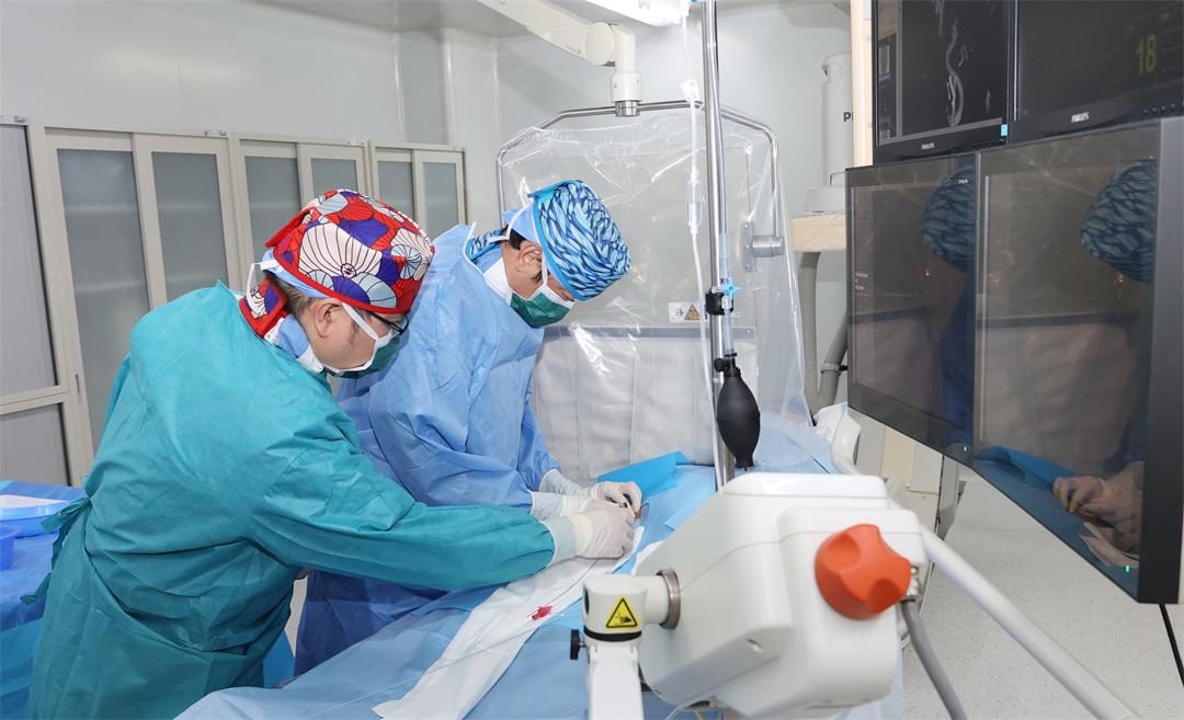 早一秒手術(shù)就多一絲康復(fù)希望。劉愛軍馬上抽組科室精干力量組成專家救治小組,實施導(dǎo)管介入取栓手術(shù)。醫(yī)護(hù)人員從右側(cè)大腿腹股溝股動脈處建立通路,在支架輔助下,取栓導(dǎo)管安全精準(zhǔn)抵達(dá)堵塞血管處。不多久,在劉愛軍團隊細(xì)心操作下,比頭發(fā)還細(xì)的導(dǎo)絲成功穿過血栓,并引領(lǐng)支架成功取出血栓。