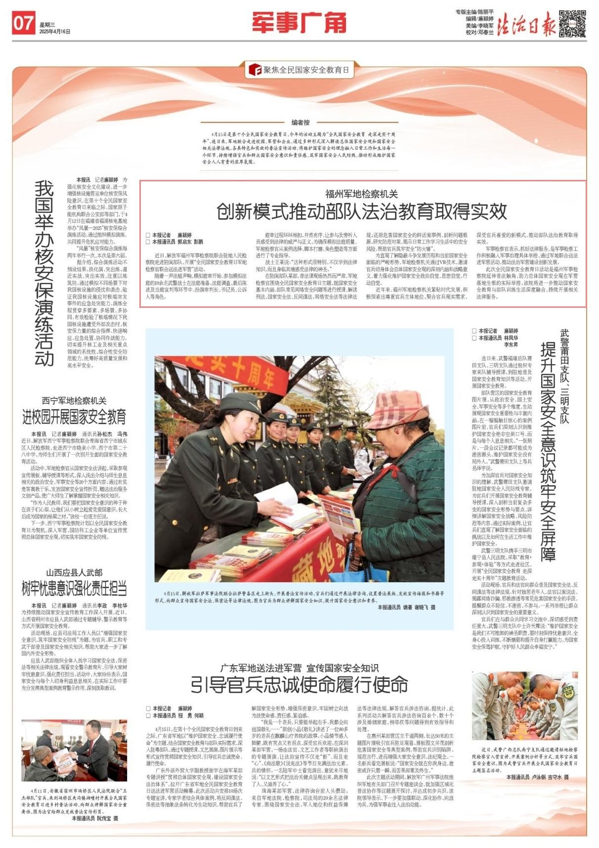此次全民國(guó)家安全教育日活動(dòng)是福州軍事檢察院延伸普法觸角、助力總體國(guó)家安全觀在軍營(yíng)落地生根的實(shí)際舉措。該院將進(jìn)一步推動(dòng)國(guó)家安全教育與部隊(duì)訓(xùn)練生活深度融合,持續(xù)開(kāi)展相關(guān)法律服務(wù)。