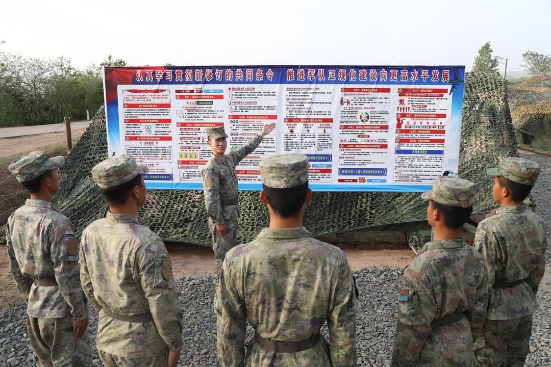 4月23日,空降兵某旅野外駐訓(xùn)分隊(duì)持續(xù)強(qiáng)化官兵學(xué)用新共同條令的意識(shí)。圖為骨干利用宣傳展板為官兵講解新條令。王彬 攝