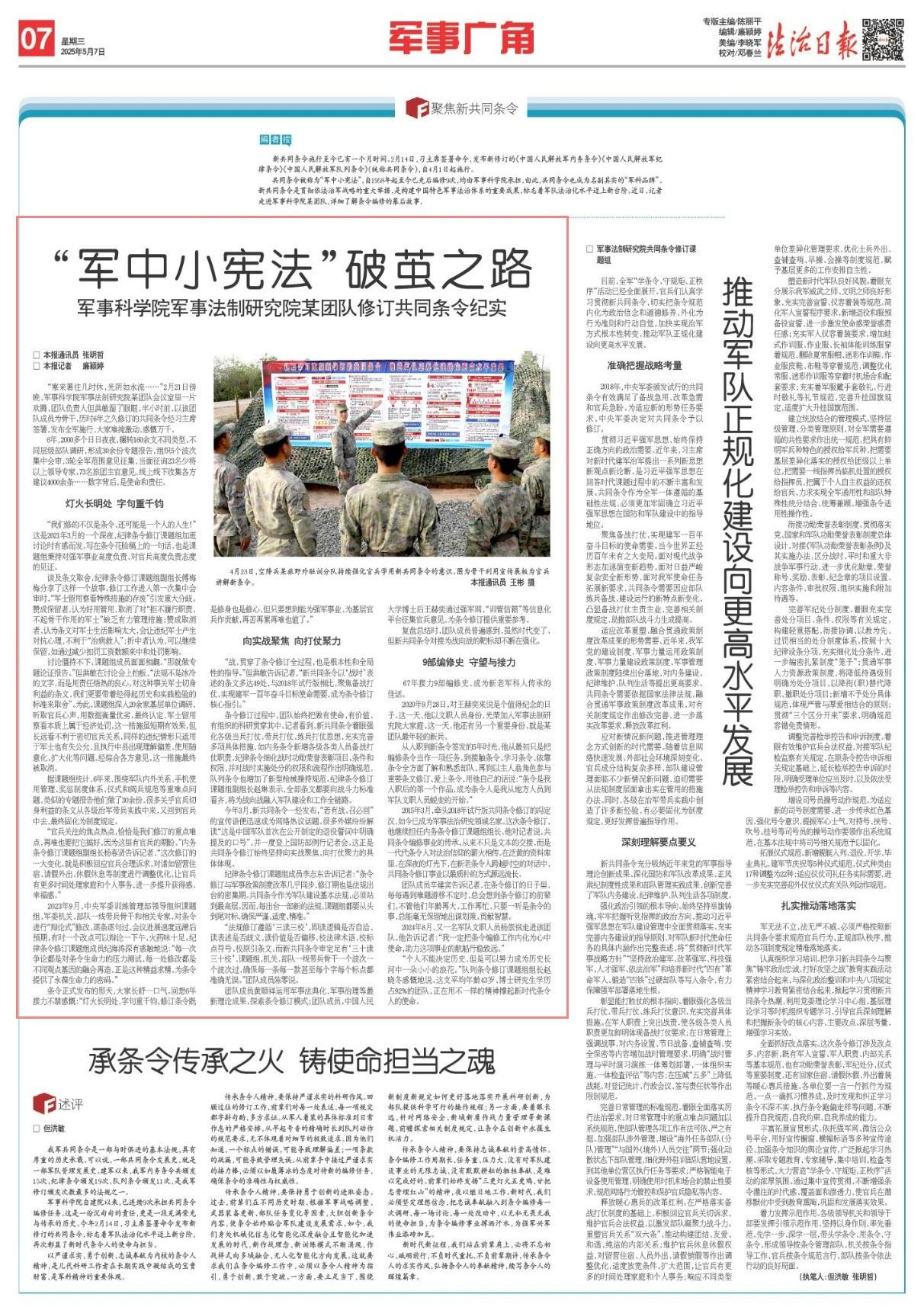 2015年3月,牽頭2018年試行版共同條令修訂的馮定漢,如今已成為軍事法治研究領(lǐng)域名家。這次條令修訂,他繼續(xù)擔(dān)任內(nèi)務(wù)條令修訂課題組組長(zhǎng)。他對(duì)記者說(shuō),共同條令編修事業(yè)的傳承,從來(lái)不只是文本的交接,而是一代代條令人對(duì)法治信仰的薪火相傳。在泛黃的資料庫(kù)里,在深夜的燈光下,在新老條令人跨越時(shí)空的對(duì)話(huà)中,共同條令修訂事業(yè)以最質(zhì)樸的方式源遠(yuǎn)流長(zhǎng)。