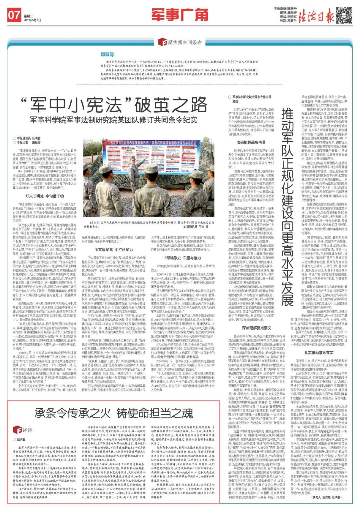 軍事科學(xué)院自建院以來(lái),已連續(xù)9次承擔(dān)共同條令編修任務(wù)。這是一份沉甸甸的責(zé)任,更是一段充滿榮光與傳承的歷史。今年2月14日,習(xí)主席簽署命令發(fā)布新修訂的共同條令,標(biāo)志著軍隊(duì)法治化水平邁上新臺(tái)階,再次彰顯了新時(shí)代條令人的使命與擔(dān)當(dāng)。
