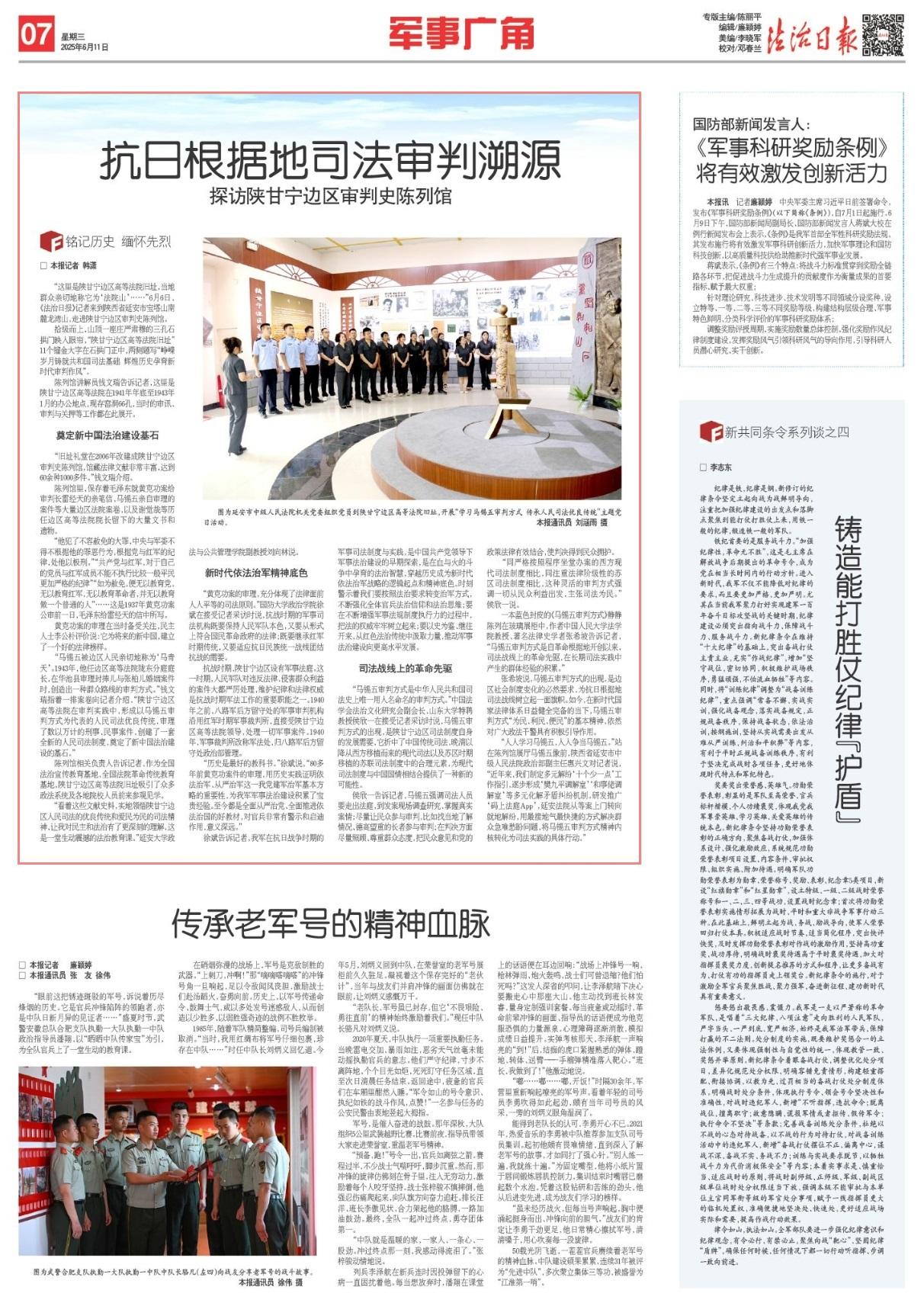 徐斌告訴記者,我軍在抗日戰(zhàn)爭時期的軍事司法制度與實踐,是中國共產(chǎn)黨領(lǐng)導(dǎo)下軍事法治建設(shè)的早期探索,是在血與火的斗爭中孕育的法治智慧,穿越歷史成為新時代依法治軍戰(zhàn)略的邏輯起點和精神底色。時刻警示著我們要按照法治要求轉(zhuǎn)變治軍方式,不斷強化全體官兵法治信仰和法治思維;要在不斷增強軍事法規(guī)制度執(zhí)行力的過程中,把法的權(quán)威牢牢樹立起來;要以史為鑒、繼往開來,從紅色法治傳統(tǒng)中汲取力量,推動軍事法治建設(shè)向更高水平發(fā)展。