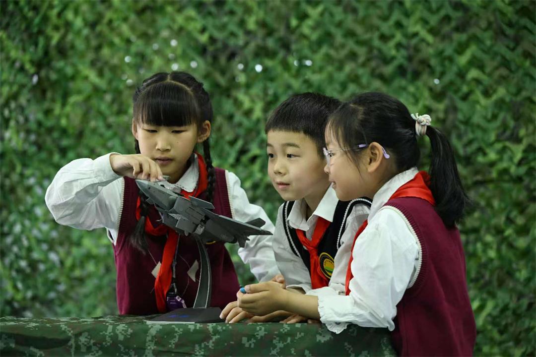 圖為孩子們體驗(yàn)裝備模型。