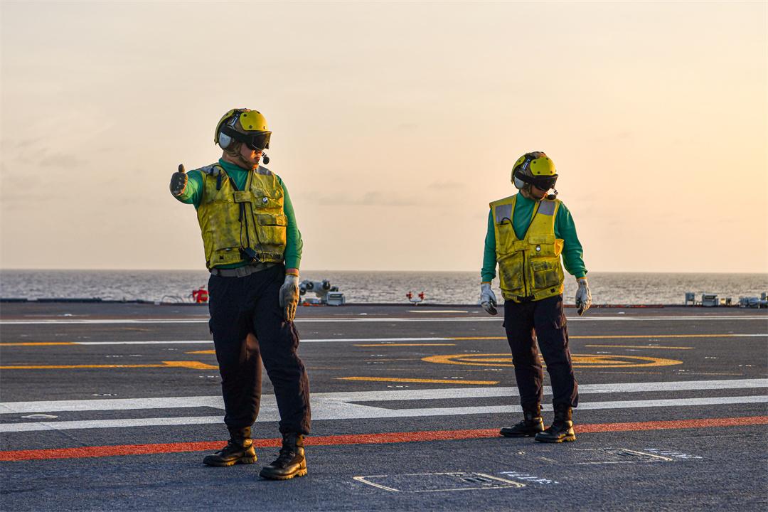 飛行甲板上,堅守在直線距離著艦跑道約7米處的待命點,推索員們站立的那條警戒線,是屬于他們的“飛鯊守望線”。
