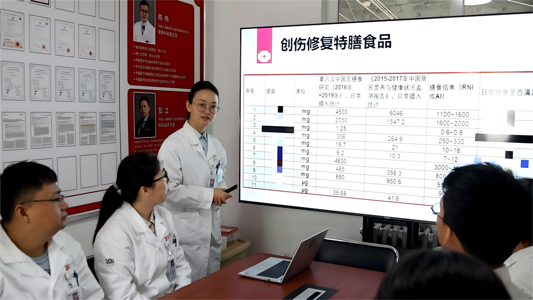 圖為營養(yǎng)科劉玲英主任帶領(lǐng)團隊針對創(chuàng)傷修復(fù)特膳食品項目進行科研攻關(guān)。張萌 攝