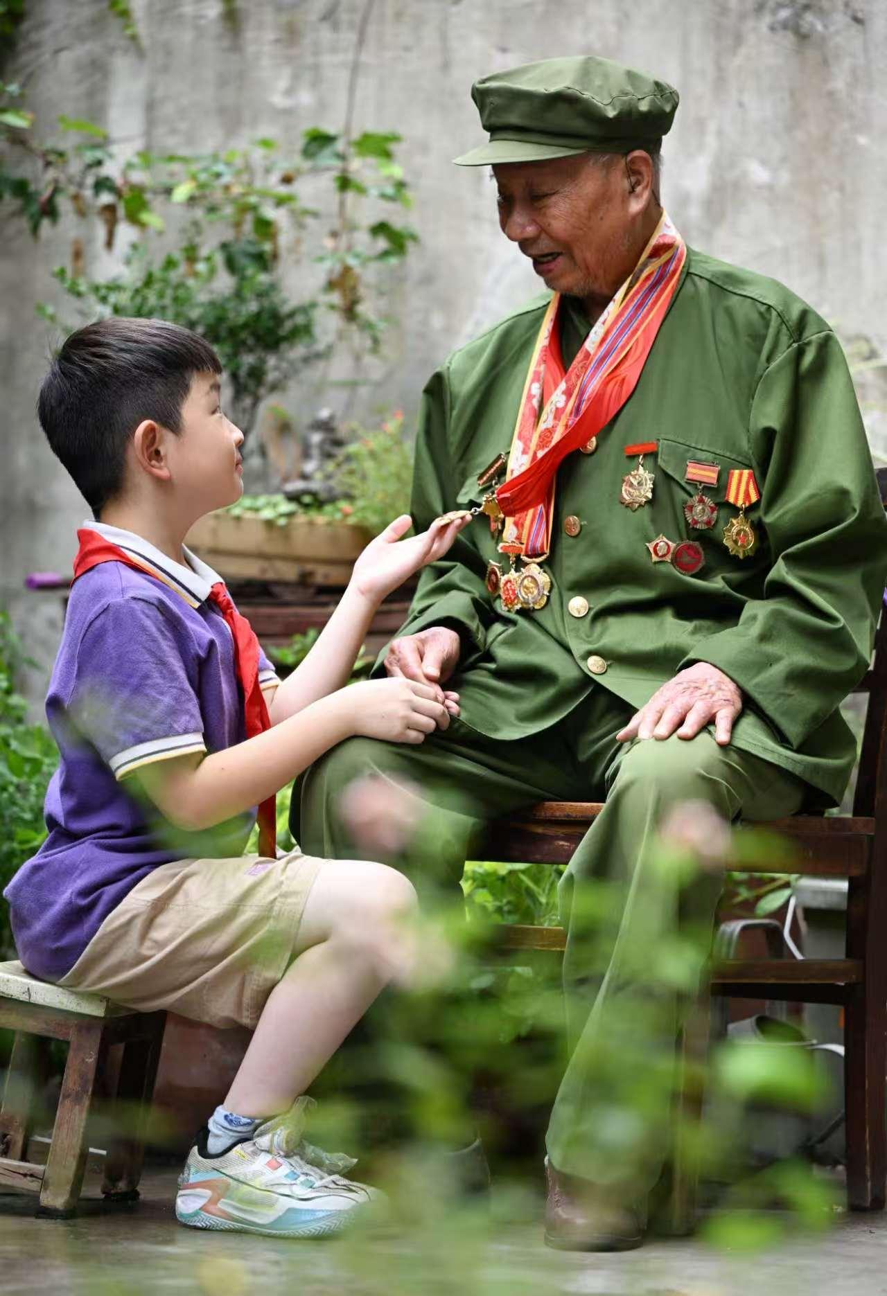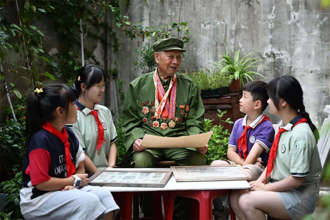 圖為孩子們走進(jìn)老兵家中,聆聽?wèi)?zhàn)斗故事。