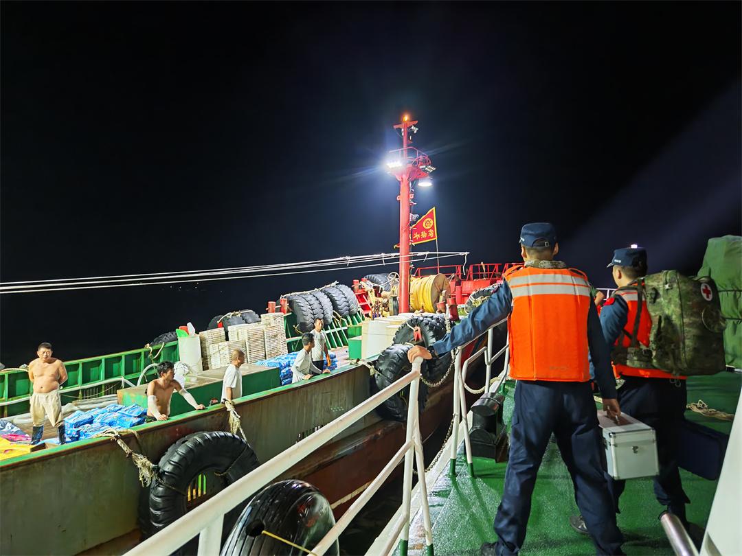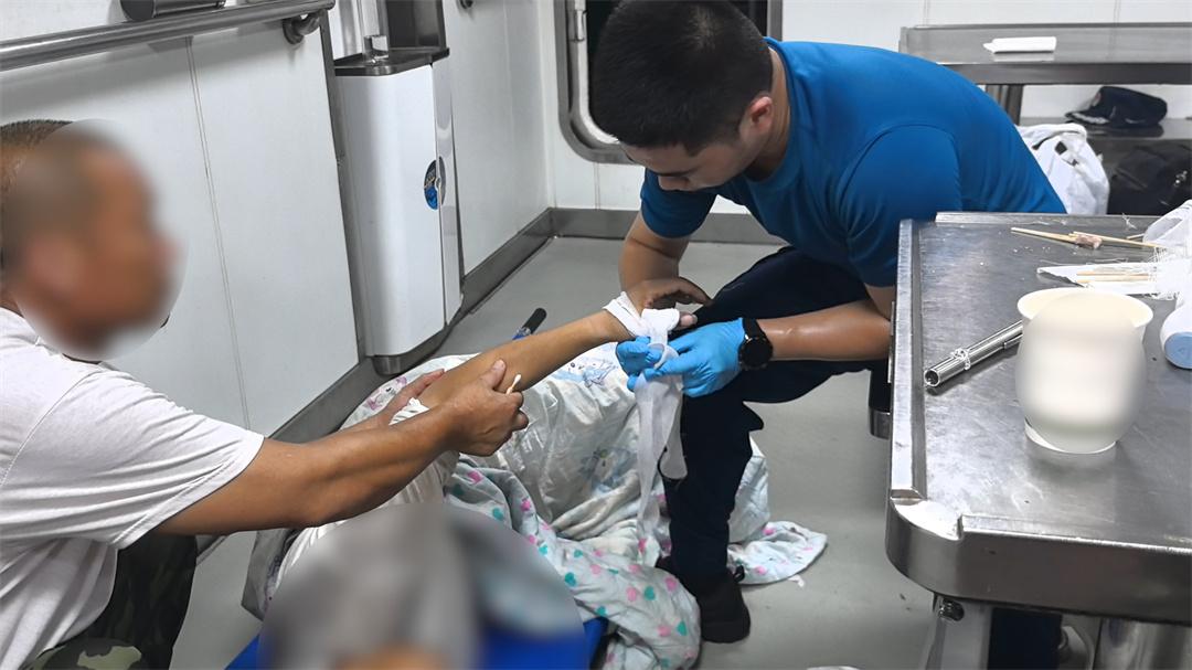 由于夜間航行,海上能見度較差,且事發(fā)海域周邊漁網(wǎng)較多,給航行帶來較大困難,永隆艦執(zhí)法員們憑借出色的駕駛技能和豐富夜航經(jīng)驗(yàn),克服諸多不利因素,穩(wěn)慎駕駛艦艇趕往事發(fā)海域。航行中,執(zhí)法員們通過多種通信方式與求助漁船保持聯(lián)系,動(dòng)態(tài)掌握船舶位置及傷員情況,隨艦醫(yī)護(hù)人員遠(yuǎn)程指導(dǎo)漁船其他人員為傷者開展先期輔助治療。