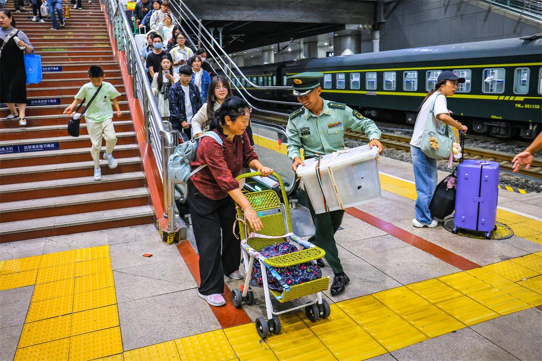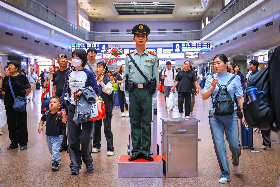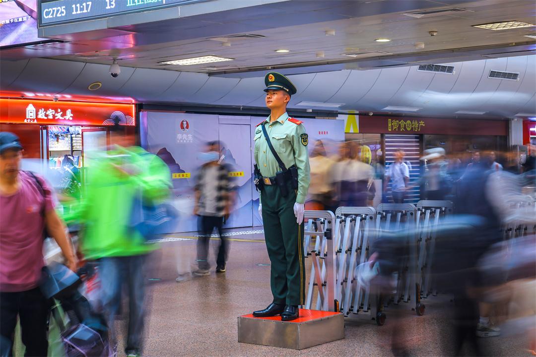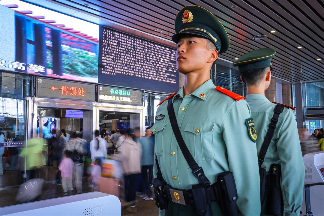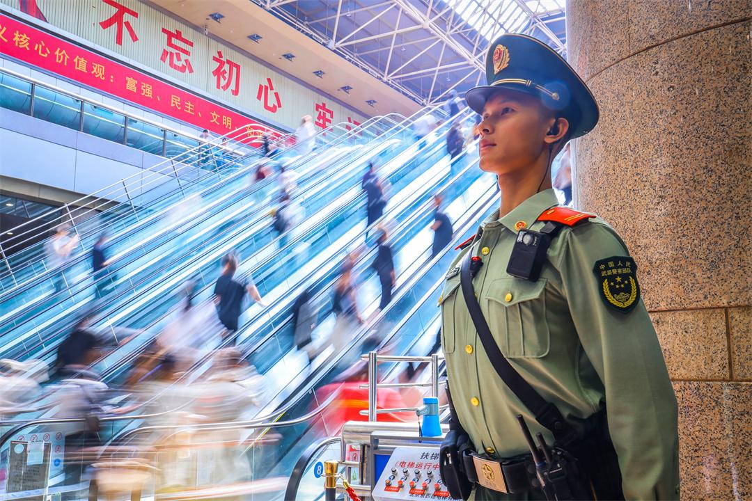 國慶假期最后兩天,北京鐵路交通樞紐迎來雙向返程客流高峰。為保障旅客安全有序出行,武警北京總隊執(zhí)勤第六支隊官兵堅守執(zhí)勤戰(zhàn)位,與重點站區(qū)管委會、鐵路公安等部門搭建聯(lián)防聯(lián)控體系,通過實時客流監(jiān)測系統(tǒng)動態(tài)調(diào)整勤務(wù)部署,在進出站口、安檢區(qū)、候車大廳等關(guān)鍵點位設(shè)置警戒哨,協(xié)助維護秩序,熱心提供幫助,以實際行動確保旅客平安順利出行。