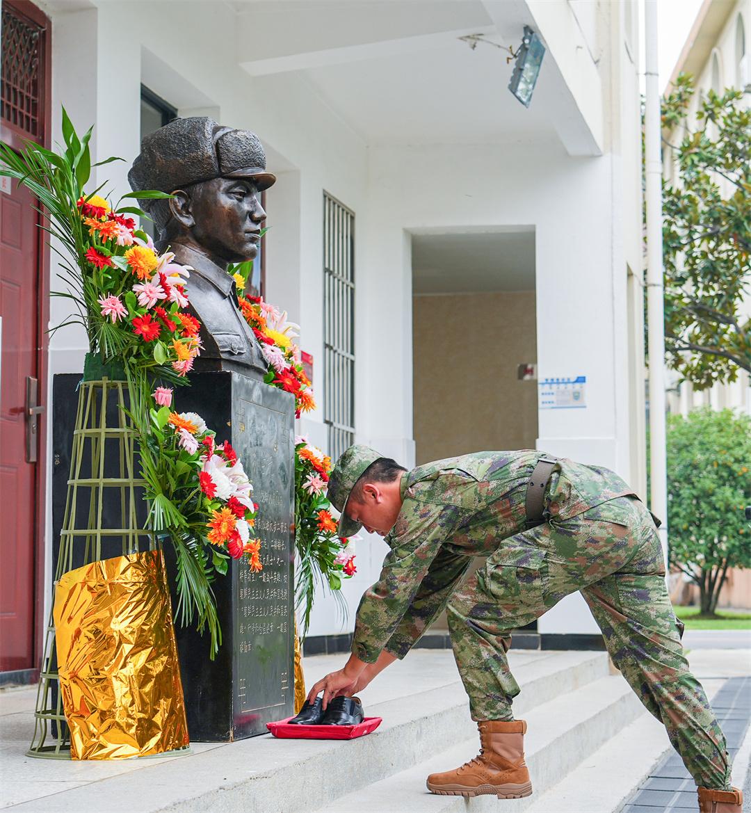 在紀(jì)念活動現(xiàn)場,齊步、俯身放鞋、敬禮……今年參加閱兵任務(wù)的排長魏一涵,小心翼翼托著那雙通過天安門的皮鞋,俯身放在老排長銅像前。這一刻,老排長終于圓夢。