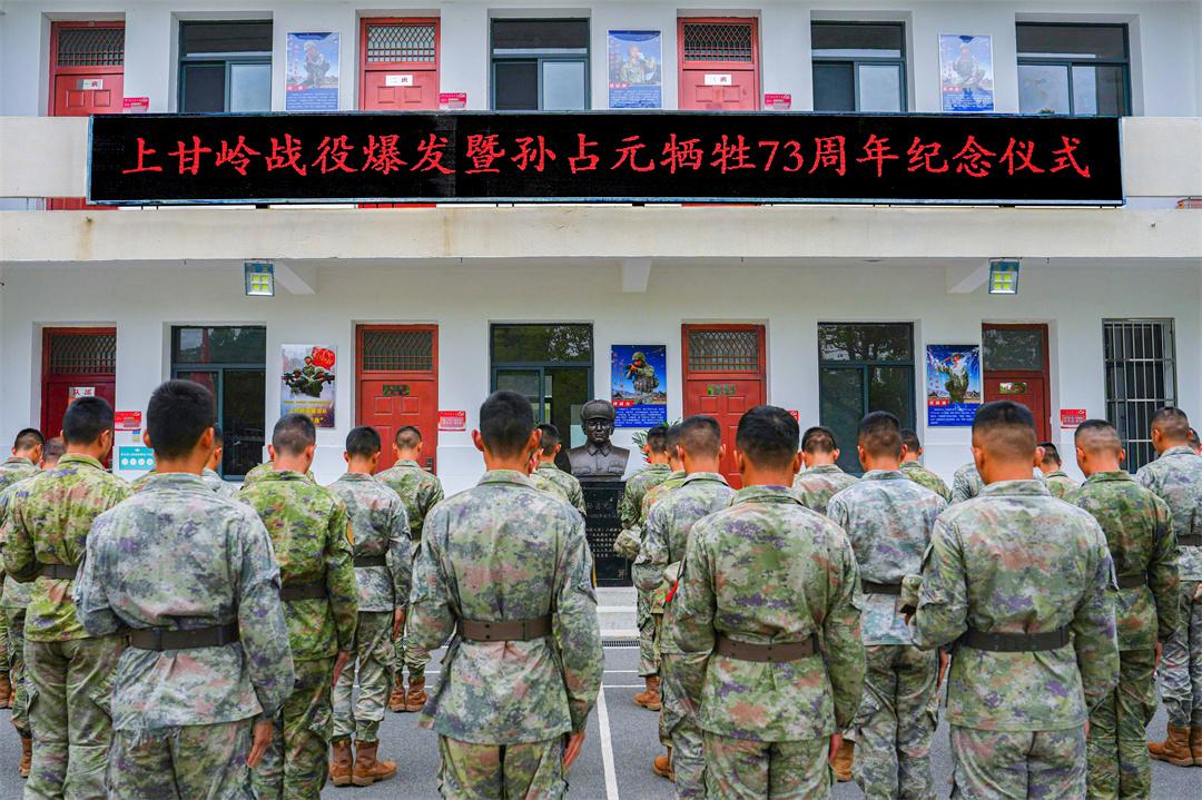 紀(jì)念儀式開始,連隊官兵仔細(xì)整理花籃綢帶,并脫帽默哀,深切緬懷孫占元老排長?;ɑ@上“紀(jì)念上甘嶺戰(zhàn)役爆發(fā)73周年”“紀(jì)念一級英雄孫占元犧牲73周年”的綢帶隨風(fēng)飄揚。