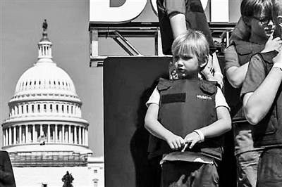 6月6日,學(xué)生們身穿防彈衣在美國華盛頓國會大廈前參加抗議活動,要求加強(qiáng)槍支管控立法