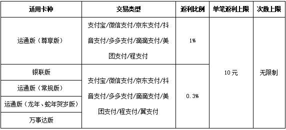2025年10月1日至2025年12月31日,持卡人通過(guò)指定入口成功報(bào)名,并綁定已激活且卡片狀態(tài)正常的菁英白金卡(運(yùn)通版)常規(guī)版或蛇年賀歲版,活動(dòng)期間滿足活動(dòng)返現(xiàn)規(guī)則的境外消費(fèi),可享5%返現(xiàn),活動(dòng)期間單卡累計(jì)最高返500元人民幣。