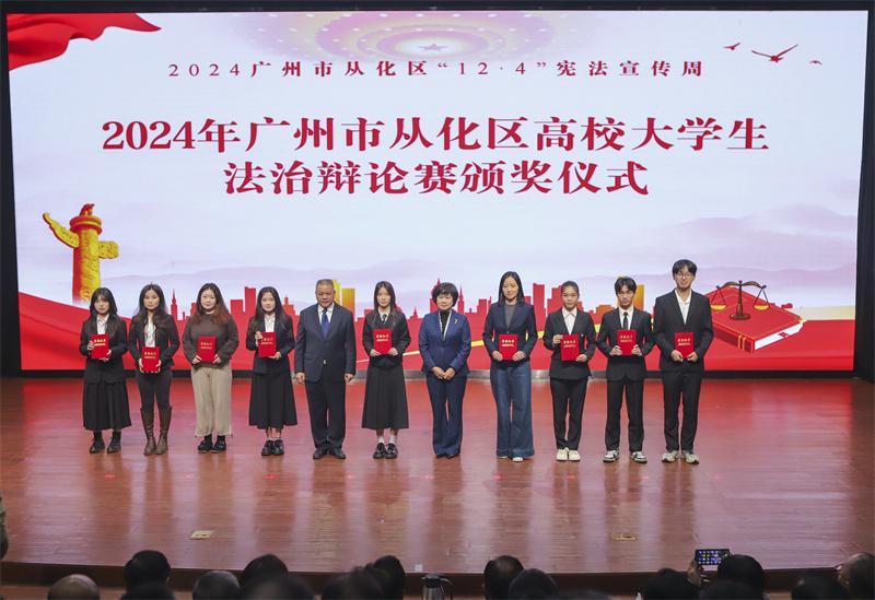 廣州南方學(xué)院的開場舞蹈《溯源》以獨(dú)特的藝術(shù)形式,展現(xiàn)了法治文化的深厚底蘊(yùn);從化區(qū)委政法委、區(qū)檢察院、區(qū)法院、區(qū)司法局、區(qū)公安分局的青年們帶來了朗誦節(jié)目《憲法頌》,傳遞出對(duì)憲法的崇高敬意和堅(jiān)定信仰;舞蹈《這一束光》則將抽象的憲法知識(shí)轉(zhuǎn)化為具象的舞蹈形象,讓孩子們用身體語言表達(dá)對(duì)憲法的理解和感悟;快板音樂劇《跟我一起學(xué)憲法》,巧妙融合了傳統(tǒng)快板藝術(shù)與現(xiàn)代教育理念,以生動(dòng)活潑的形式引領(lǐng)大家走進(jìn)憲法的神秘殿堂。最后,歌曲《歌唱祖國》將全場氣氛推向了高潮。除了文藝表演,當(dāng)天還舉辦了“2024年度廣州市從化區(qū)高校大學(xué)生法治辯論賽”頒獎(jiǎng)活動(dòng),9所高校代表、9名優(yōu)秀指導(dǎo)老師、11名優(yōu)秀辯手上臺(tái)領(lǐng)獎(jiǎng)。