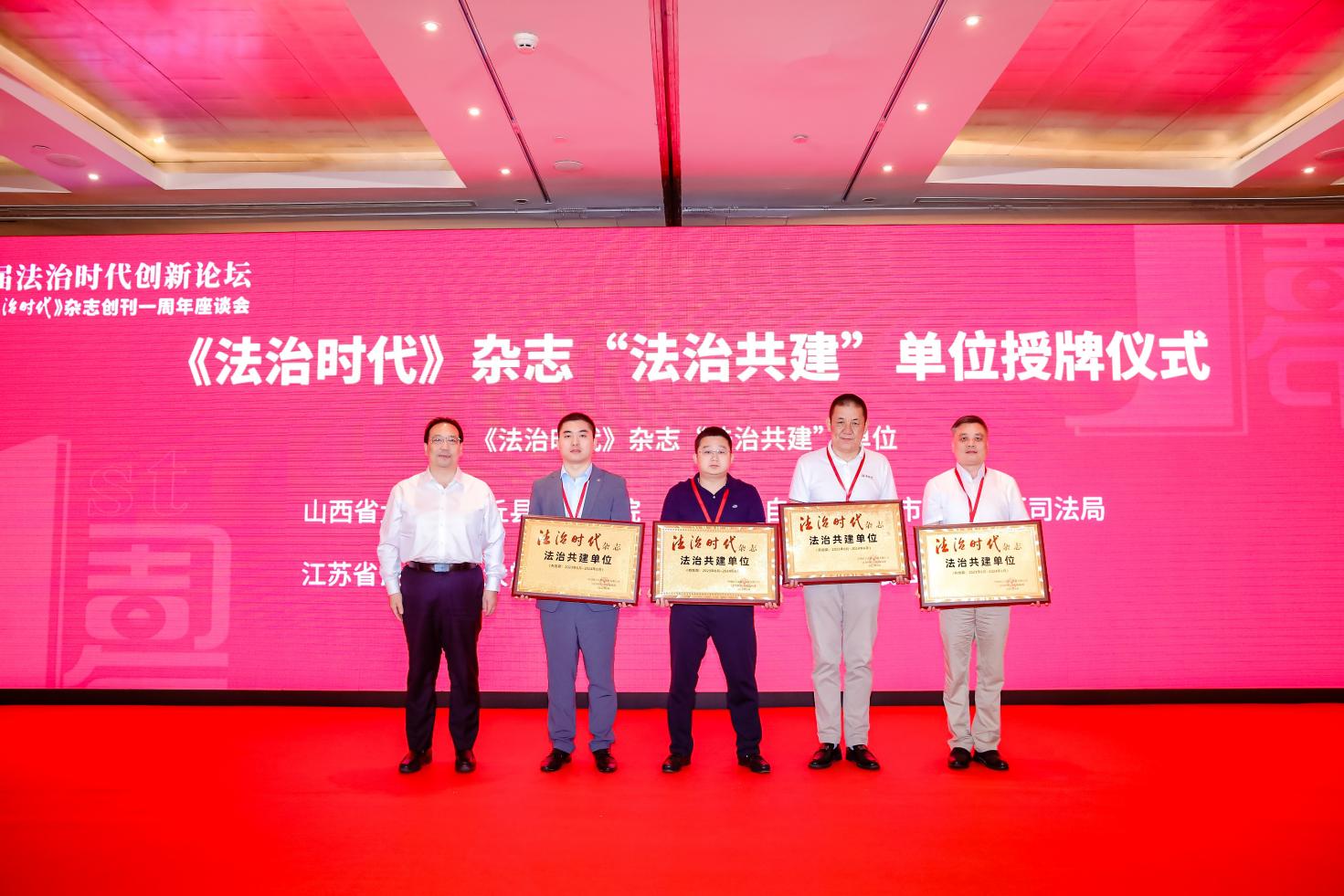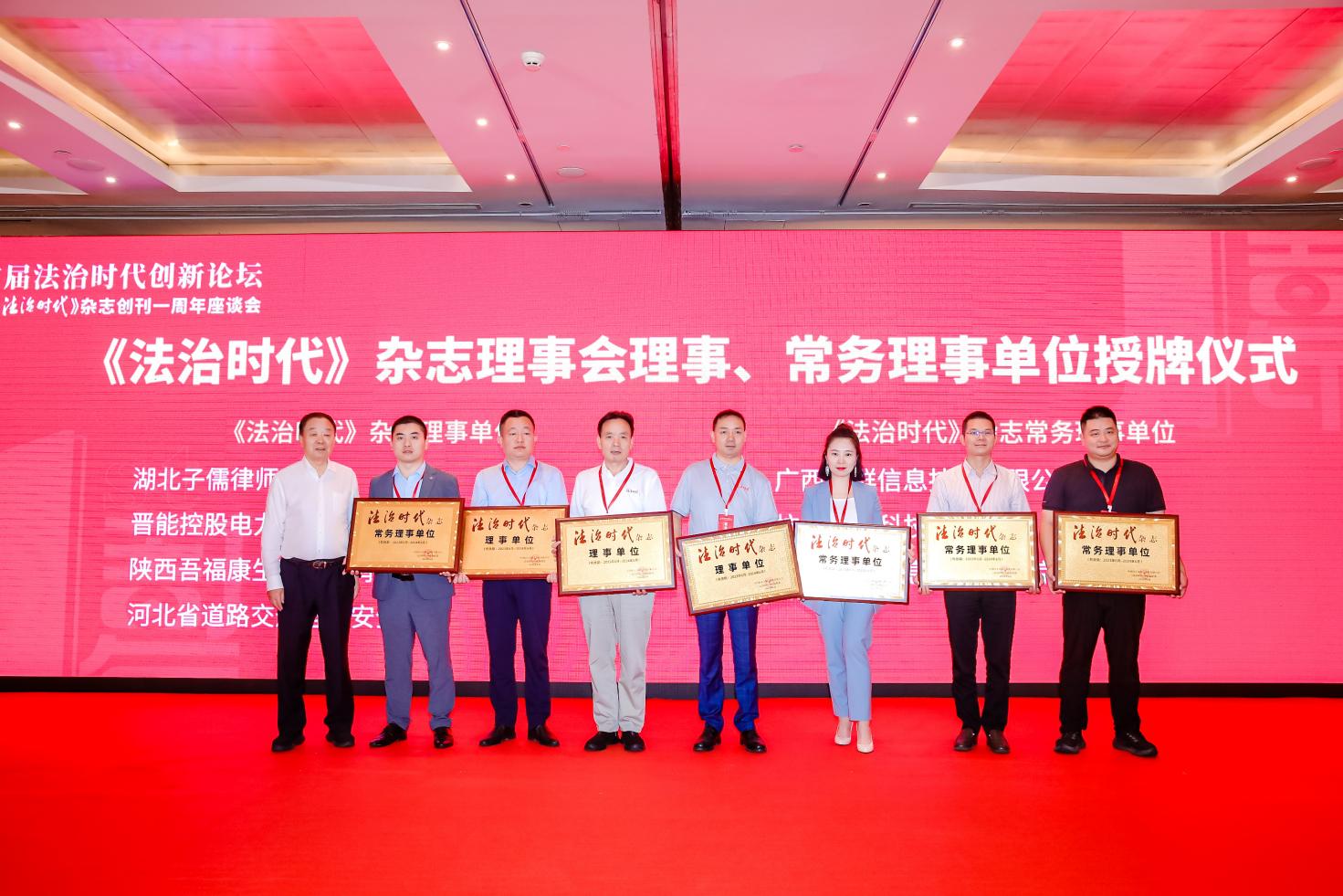 主旨演講環(huán)節(jié)結(jié)束后,進(jìn)行了《法治時(shí)代》雜志理事會(huì)理事單位、常務(wù)理事單位、《法治時(shí)代》雜志“法治共建”單位聘任儀式。第十二屆全國(guó)人大法律委主任委員喬曉陽(yáng)、中國(guó)出版集團(tuán)有限公司總經(jīng)理、黨組副書記常勃分別為理事單位、常務(wù)理事單位和“法治共建”單位授牌。