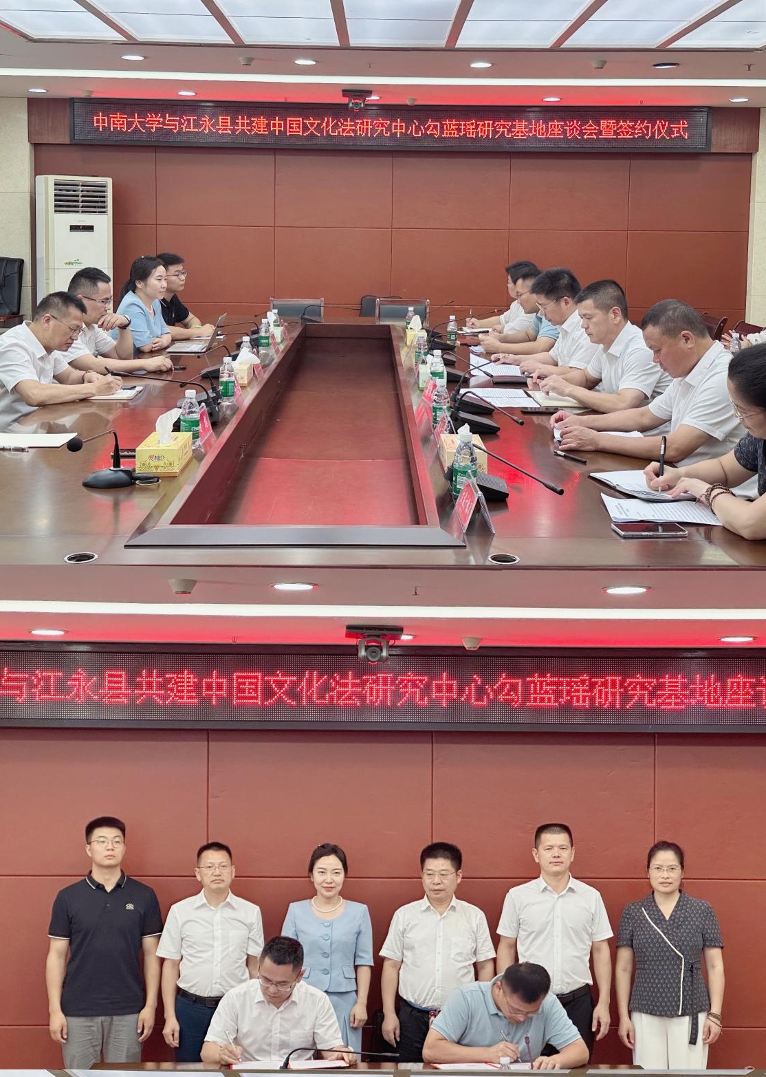 7月28日,“中南大學(xué)中國(guó)文化法研究中心勾藍(lán)瑤研究基地”在湖南省永州市江永縣蘭溪瑤族鄉(xiāng)勾藍(lán)瑤寨揭牌并簽署共建勾藍(lán)瑤研究基地合作協(xié)議,中共江永縣委書(shū)記唐德榮,縣委常委、宣傳部長(zhǎng)高厚德,副縣長(zhǎng)蔣劍平,中南大學(xué)法學(xué)院院長(zhǎng)許中緣,中國(guó)文化法研究中心執(zhí)行主任易玲、法學(xué)院教授唐東楚、講師郭壬癸以及縣委各部門負(fù)責(zé)人出席座談會(huì)及簽約儀式。