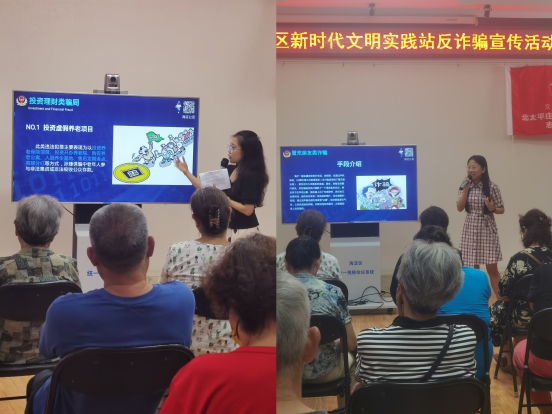 宣講團(tuán)成員王舒琦、李成秀在北京市海淀區(qū)北太平莊街道明光北里社區(qū)的社區(qū)活動(dòng)中為老年人們進(jìn)行了防范養(yǎng)老詐騙宣傳。兩位同學(xué)結(jié)合類型分析與實(shí)務(wù)案例,重點(diǎn)介紹了誘導(dǎo)消費(fèi)類、投資理財(cái)類、養(yǎng)老保險(xiǎn)類等典型騙局的詐騙方式,分享了針對(duì)性的防范路徑與預(yù)防措施,并給出了具體的防范建議。兩位同學(xué)的講解幫助老年人充分認(rèn)識(shí)到防范詐騙的重要性,樹立了反詐意識(shí),了解了防詐知識(shí)。