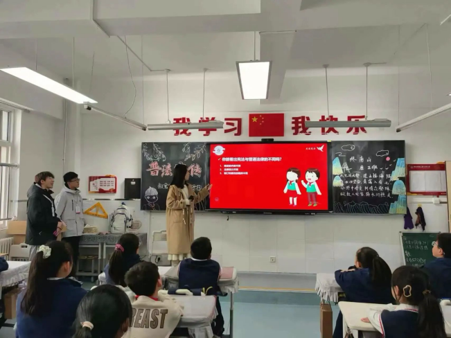 在西安市曲江第十四小學,法律服務中心學生志愿者組成的11支普法小組為三、四、五年級的學生們進行了一場趣味“法律啟蒙”。面對充滿童趣的小學生,志愿者們通過講解PPT、組織學生觀看法治小視頻、設置互動問答的形式將復雜的法律知識簡單化,以趣味性的方式傳授給孩子們。學生們競相舉手,積極地回答問題,整個教室充滿了歡聲笑語。