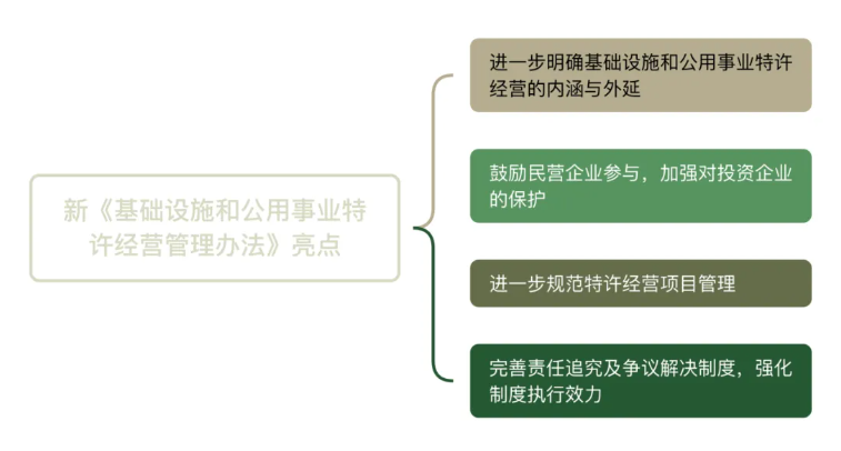 此文對《辦法》亮點進行系統(tǒng)解讀,主要包括基礎設施和公用事業(yè)特許經(jīng)營的內涵與外延、對投資企業(yè)保護的制度修訂要點,以及規(guī)范特許經(jīng)營項目管理及強化相關規(guī)范執(zhí)行效力的修訂亮點,具體如下。