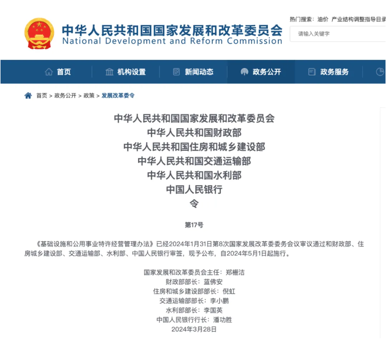 《基礎設施和公用事業(yè)特許經(jīng)營管理辦法》(以下簡稱“《辦法》”)已經(jīng)2024年1月31日第8次國家發(fā)展改革委委務會議審議通過和財政部、住房城鄉(xiāng)建設部、交通運輸部、水利部、中國人民銀行審簽,自2024年5月1日起施行。原《基礎設施和公用事業(yè)特許經(jīng)營管理辦法》(國家發(fā)展改革委等6部委2015年第25號令)同時廢止。