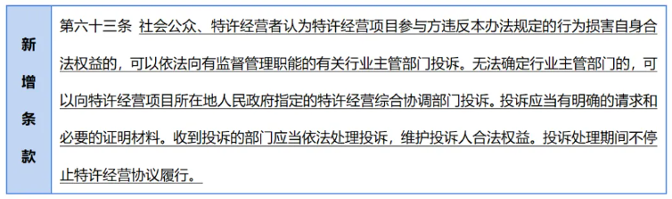 《辦法》于第六十三條中補充了特許經(jīng)營項目相關的投訴處理制度,為社會公眾、特許經(jīng)營者利益的維護提供了法定的新途徑,進一步保障了社會公眾及特許經(jīng)營者的利益。明確可依法向有監(jiān)督管理職能的有關行業(yè)主管部門投訴,無法確定行業(yè)主管部門的,可以向特許經(jīng)營項目所在地人民政府指定的特許經(jīng)營綜合協(xié)調部門投訴。投訴應當有明確的請求和必要的證明材料。收到投訴的部門應當依法處理投訴,維護投訴人合法權益。