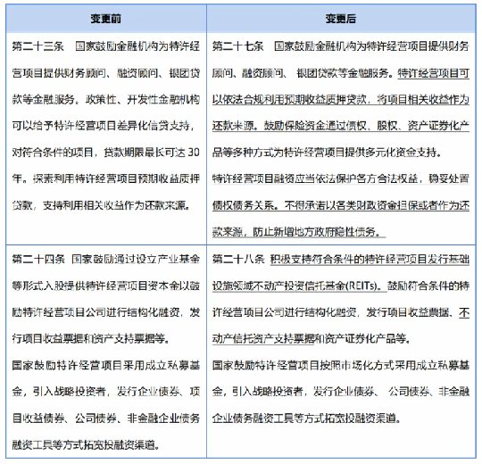 多元化投資融資渠道,支持利用相關收益作為還款來源。依據(jù)《辦法》第二十七條及第二十八條,修訂后《辦法》補充特許經(jīng)營項目可以依法合規(guī)利用逾期收益質押貸款,鼓勵保險資金通過債權、股權、資產(chǎn)證券化產(chǎn)品等多種方式為特許經(jīng)營項目提供多元化資金支持,積極支持符合條件的特許經(jīng)營項目發(fā)行基礎設施領域不動產(chǎn)投資信托基金(REITs),進一步擴大了特許經(jīng)營區(qū)項目的融資方式。此外,《辦法》亦支持利用相關收益作為還款來源,一定程度上減輕了投資企業(yè)的還款壓力,有利于鼓勵民營企業(yè)的參與,確保項目的有序開展。