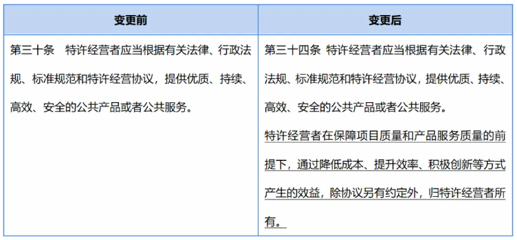 鼓勵提升效率,創(chuàng)新方式產(chǎn)生額外效益歸屬特許經(jīng)營企業(yè)?!掇k法》第三十四條明確特許經(jīng)營者在保障項目質量和產(chǎn)品服務質量的前提下,通過降低成本、提升效率、積極創(chuàng)新等方式產(chǎn)生的效益,除協(xié)議另有約定外,歸特許經(jīng)營者所有。該條的補充,一定程度上激發(fā)了特許經(jīng)營者的積極性,既能激發(fā)特許經(jīng)營項目的創(chuàng)新,又增加了特許經(jīng)營者的收益來源,有利于特許經(jīng)營項目建設的良性發(fā)展。