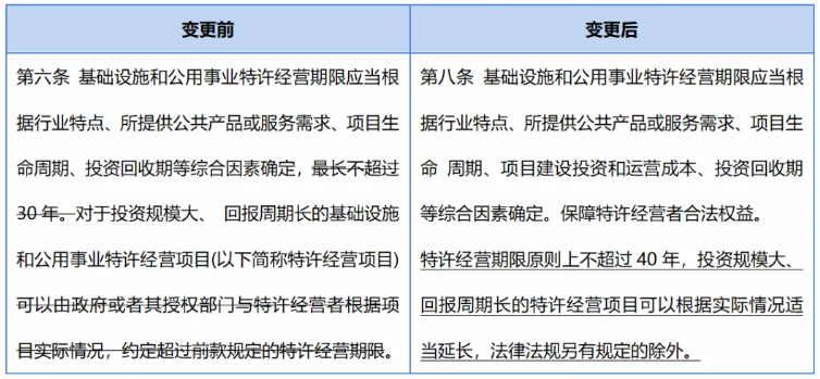 原規(guī)定特許經(jīng)營期限最長不超過30年,為保障特許經(jīng)營者合法權益,《辦法》中第八條明確特許經(jīng)營期限原則上不超過40年,投資規(guī)模大、回報周期長的特許經(jīng)營項目可以根據(jù)實際情況適當延長,法律法規(guī)另有規(guī)定的除外。