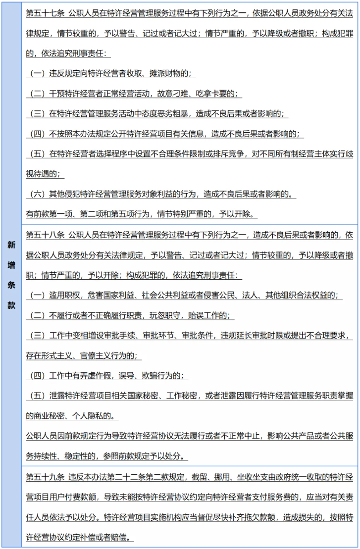 明確公職人員在特許經(jīng)營管理服務中的違法行為及責任承擔?!掇k法》第五十七條、第五十八條明確在公職人員在存在規(guī)定行為的,依據(jù)公職人員政務處分有關法律規(guī)定,情節(jié)較重的,予以警告、記過或者記大過;情節(jié)嚴重的,予以降級或者撤職;構成犯罪的,依法追究刑事責任。