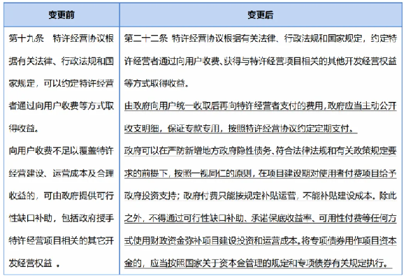 本次修訂中,于《辦法》第五條特許經(jīng)營原則中補充“根據(jù)風險性質以及特許經(jīng)營各方風險管控能力,明確風險分擔機制并切實執(zhí)行,保障項目持續(xù)穩(wěn)定實施”,明確項目經(jīng)營風險應由政府和社會資本分擔,避免風險由社會企業(yè)獨擔,從原則層面加強了對投資企業(yè)的保護。