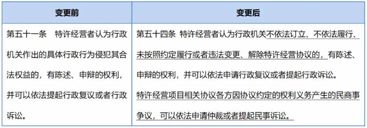 補充特許經(jīng)營項目中仲裁及民事訴訟的適用規(guī)定,完善爭議解決制度。《辦法》第五十四條明確,除原規(guī)定的申請行政復議或提起行政訴訟外,特許經(jīng)營項目相關協(xié)議各方因協(xié)議約定的權利義務產(chǎn)生的民商事爭議,可以依法申請仲裁或者提起民事訴訟。