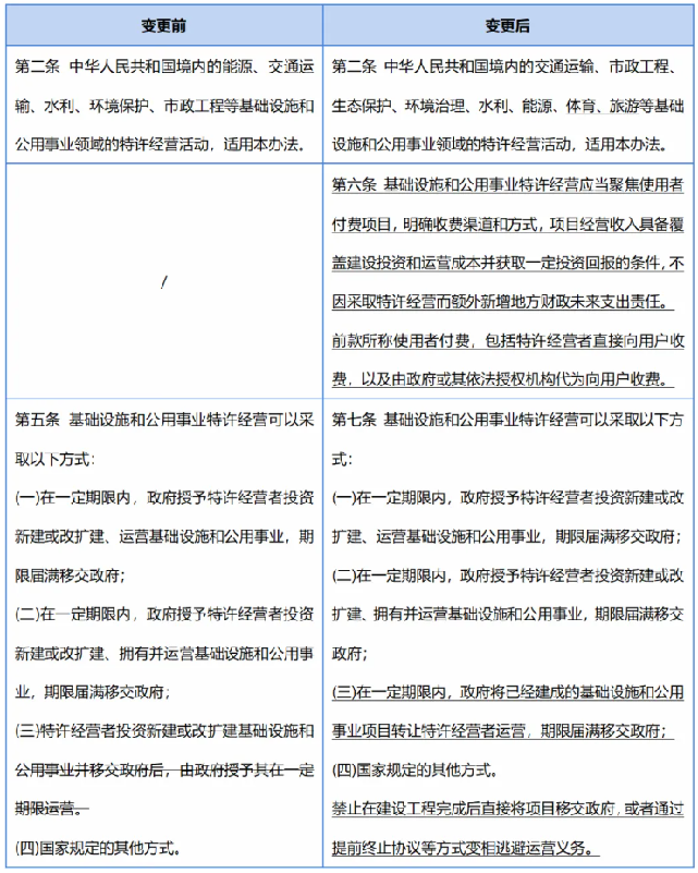 在適用領域方面,限定為“交通運輸、市政工程、生態(tài)保護、環(huán)境治理、水利、能源、體育、旅游等”,在原辦法基礎上補充了體育及旅游領域的適用;在適用項目方面,聚焦于使用者付費項目,明確收費渠道和方式,具體包括特許經(jīng)營者直接向用戶收費,以及由政府或其依法授權機構代為向用戶收費;在特許經(jīng)營方式方面,于《辦法》第七條明確列舉,完善原列舉表述方式,禁止提前移交變相逃避運營義務。